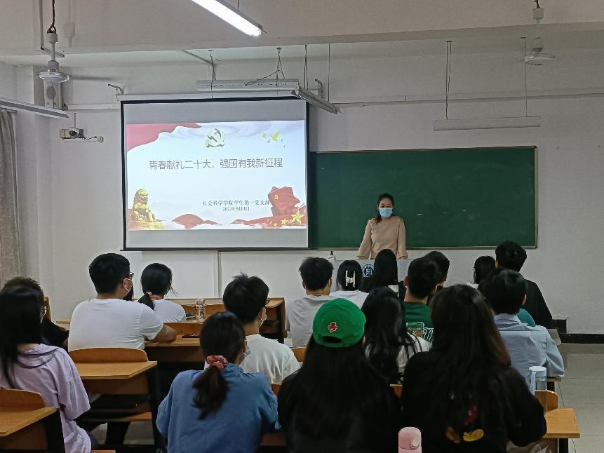 首先,学生第二党支部书记张雪梅向大家介绍了党的二十大召开的重要意义。希望大家明确作为新时代的青年大学生,身上应当肩负国家复兴和民族繁荣的责任和使命,特别是作为发展对象和入党积极分子,更应该以身作则,为党的二十大胜利召开作出应有地努力。