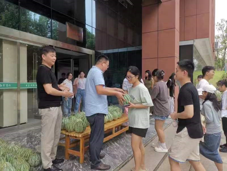 会后,各位老师代表学院将西瓜慰问品发放到同学们的手中。