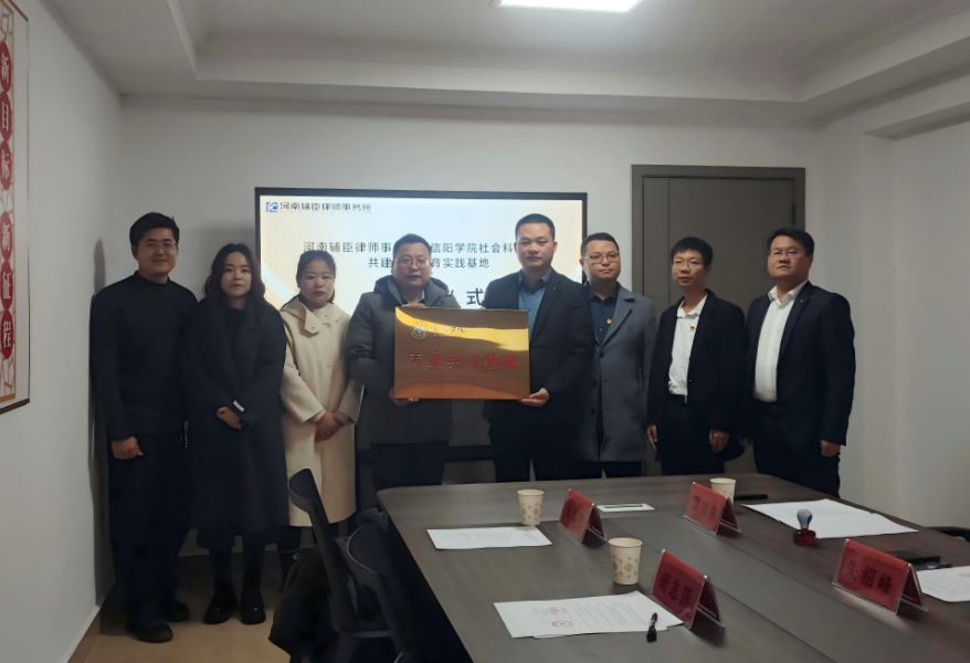 为创新人才培养模式,推动理论教学与法律实务深度融合,12月4日下午,太阳成集团tyc539与河南辅臣(信阳)律师事务所合作共建教育实践基地授牌仪式顺利举行。学院党总支书记胡志国、学工负责人陈苗苗及相关教师代表,律师事务所主任、高级合伙人及律师团队共同出席仪式。