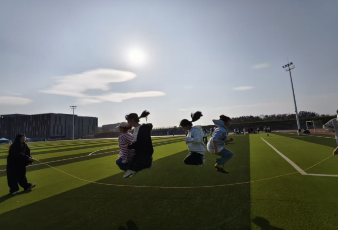 第一个游戏是“跳大绳”,按人数分好小组后,两名同学负责甩绳,剩下的人则依次进入“绳内”,两分钟之内,跳的次数最多的小组获胜。这项游戏很好地锻炼了团队协作能力,无形中便拉近了同学之间的距离。