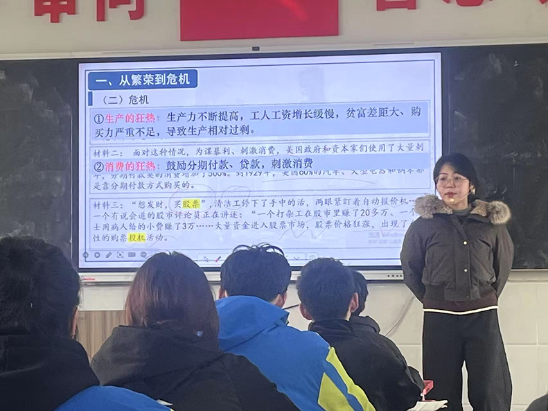 课堂上,浉河中学的刘老师以“危机与选择”为线索,通过丰富的史料呈现、课堂互动,结合教材引导学生深入分析经济大萧条时代的社会困境与罗斯福新政的应对之策。刘老师不仅梳理了新政的实施背景和具体措施,更着重引导学生思考政府角色转变、制度创新与社会公平等深层议题。课堂气氛活跃,学生围绕“罗斯福新政”“新经济政策”和“中国的改革开放”进行对比,各抒己见,展现了良好的历史思辨能力。