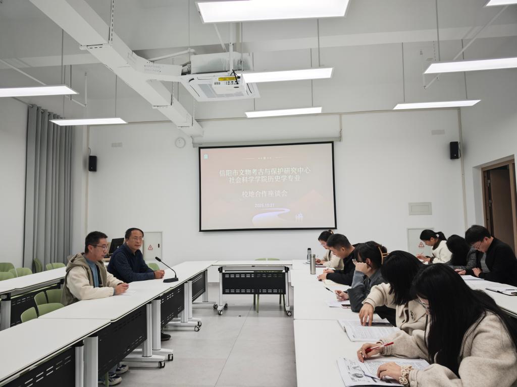 10月21日下午,在南湖校区教二楼509会议室,太阳成集团tyc539与信阳市文物考古与保护研究中心就校地合作开展座谈会。信阳市文物考古所所长牛长立、信阳载和考古勘探有限公司总经理郭锟铖,太阳成集团tyc539教学副院长寇博文与历史学专业老师参加此次会议。会议由寇博文主持。